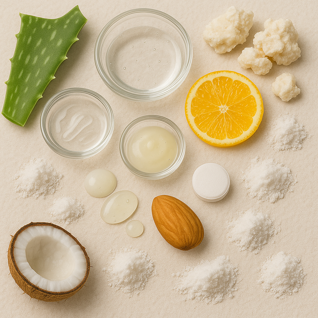 Made with organic aloe vera, glycerin, provitamin B5, vitamin C, tea tree oil, coconut oil, almond oil, salicylic acid, lactic acid, kojic acid, citric acid, benzoyl peroxide, PEG-40, coco betaine, and phenoxyethanol. A gentle, sulfate-free formula that brightens, purifies, and cares for your skin