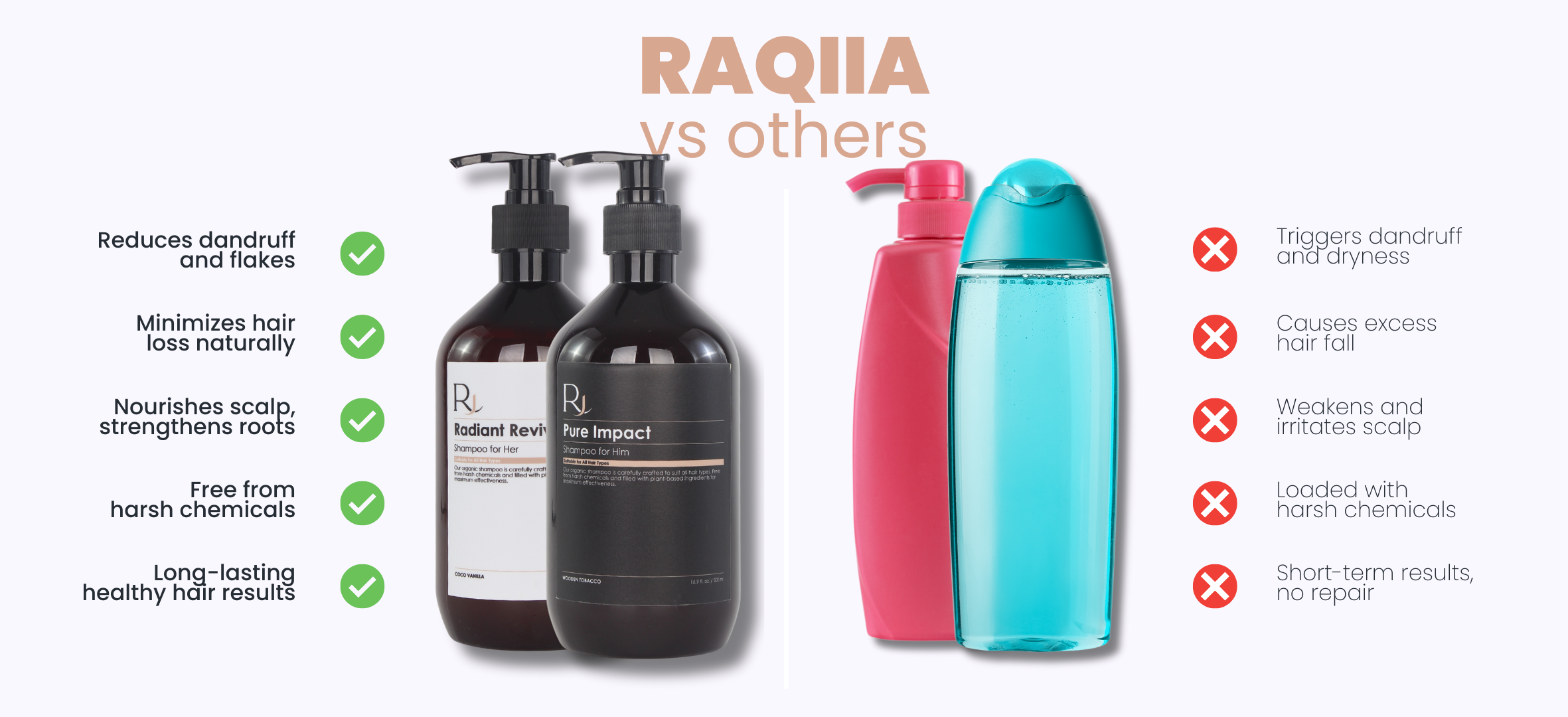 While others coat your scalp with harsh chemicals, Raqiia strengthens, purifies, and restores — for cleaner, stronger, and healthier hair every wash.