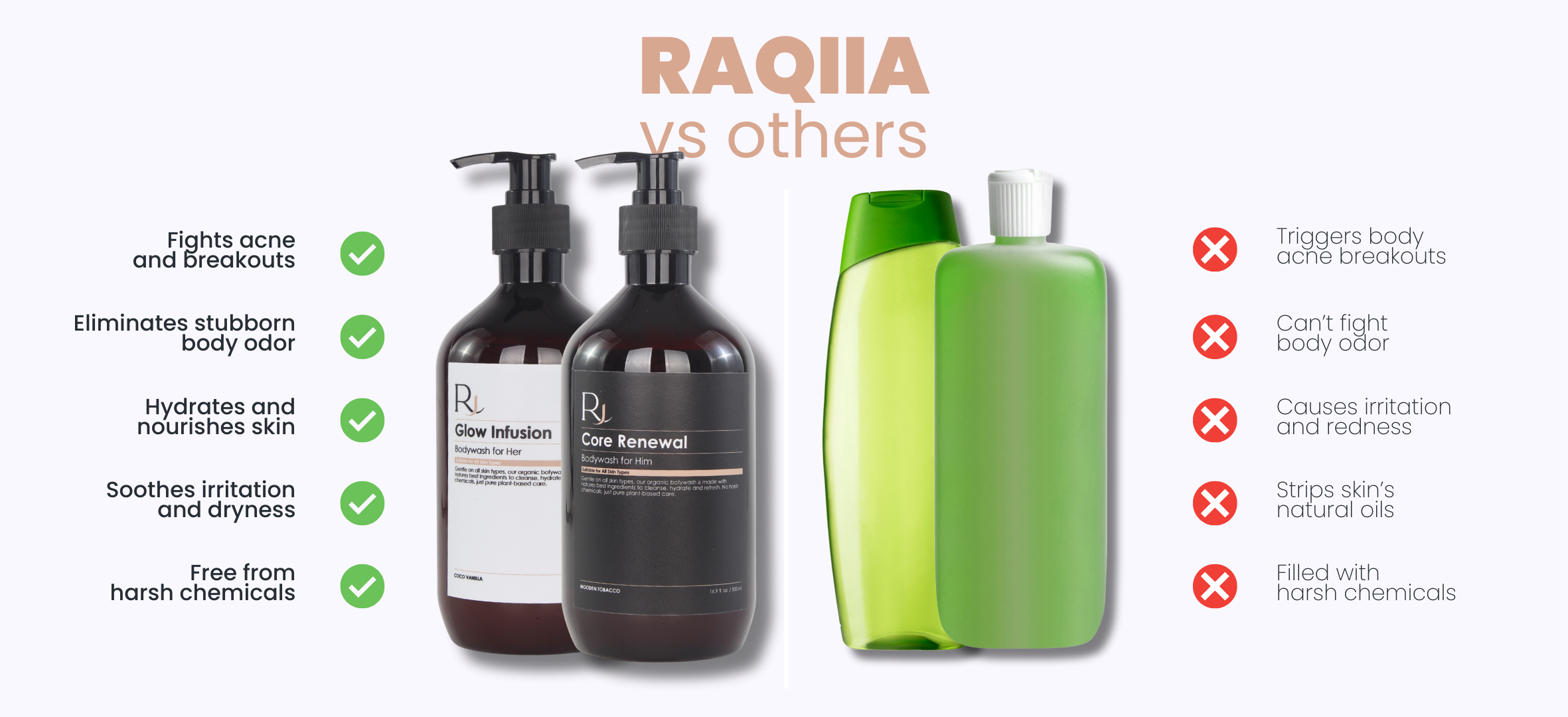 While others only mask the issues, Raqiia cleanses, nourishes, and refreshes — for clear, soft, and long-lasting freshness after every shower.