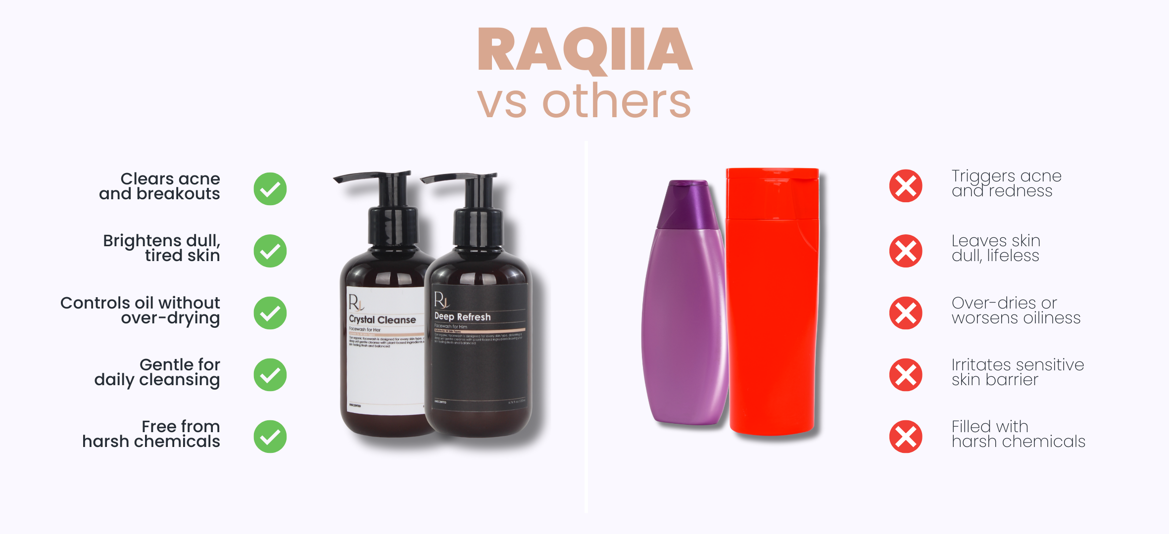While others strip your skin, Raqiia purifies, balances, and revives — for a clear, fresh, and naturally glowing face.